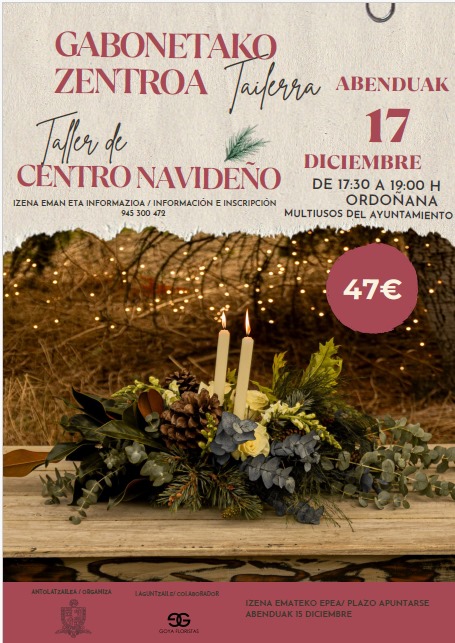 TALLER DE CENTRO NAVIDEÑO por Donemiliagako Udala | Dic 11, 2025 | Noticias FECHA: 17 de diciembre de 2025 HORA: De 17:30 a 19:00 horas LUGAR: Sala multiusos del Ayuntamiento de San Millán (Ordoñana) INFORMACION E INSCRIPCION: Hasta el 15 de diciembre, en el teléfono 945300472 o en las oficinas municipales. PRECIO: 47 € CARTEL INFORMATIVO
